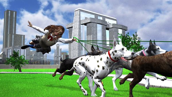 Kaz42 #2 Learning to Fly… - This one has a great perspective view. I like the low angle looking up. Aiko has an appropriately terrified expression. That is very clever, the way you grouped those dog leashes into the ring in her hand.