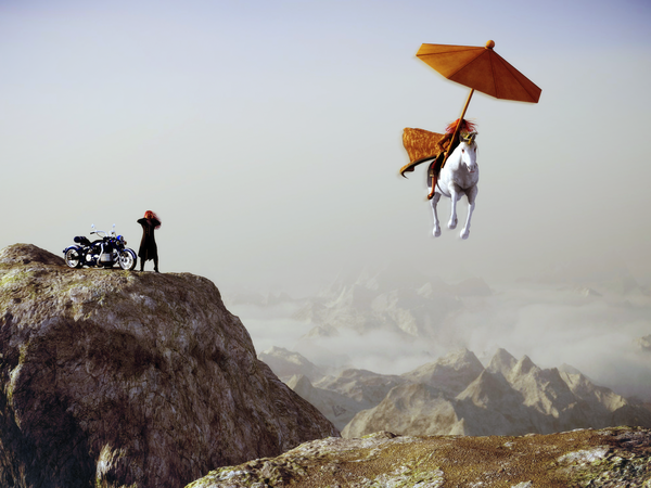 Elf Dykina had a long things-to-do-before-I-die list.This seemed right to her because elves usually live a long time and because Dykina had a lot of time on her hands every day. For number 265, Dykina, accompanied by human boyfriend Aval Knaval, ascended Mount Zim and, riding her faithful unicorn Smar, jumped, with a slight assist from a wind umbrella, over to Mount Zam. Aval, who had made the jump many times on his Motorbike Viking, cheered her on.