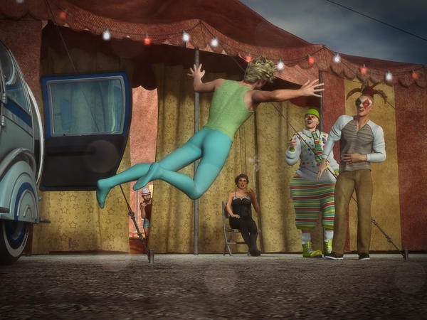 Almost showtime and dashing Don was late! His big dream, the one and only thing he had to do before he died, was to walk the tightrope in a big top show. As he leapt from his vehicle, he tripped over a support cable and went flying. "They better have a big net for ya, kid," said the clown, and "Ha ha ha."
