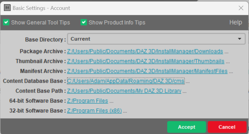 It should point to the Z:/Users/User/AppData/Roaming/daz3d/cms