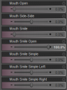 The second thing I'd consider is going to the 'lower face' bone off the head bone in the node tree. There you will be able to pose the lower jaw, and in so doing open the mouth. Then you'll also find nodes for the corners of the mouth, lips etc. It will be slow work, as the smile sliders move lots of these bits all at once.