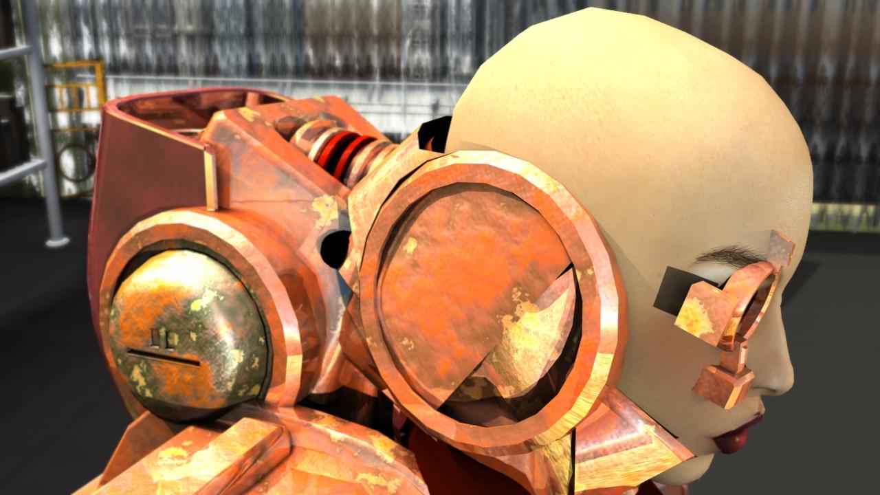 Anyway I’d like explain the figure if you are interested. It’s a drone trooper in 3 similar carrara metal shaders which can be bought in the DAZ Store, but with the head pulled all the way back. Please see the second picture. The idea is that the Trooper is now a protector AND pleasure model (to fit in with the 1970s politically incorrect narrative). The female model pops up from within the trooper after the head pulls back. Note the Driod Exterior face has lipstick on it to suggest it's a female bot inside ;-).