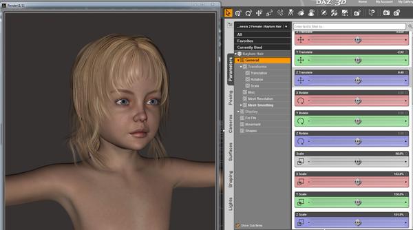 I ran in to a mystery today. Kaylum Hair will not follow the Youth Morph properly. It moves vertically down with the shorter body size, but it gets much too small for the head. I have updated Growing Up for Genesis 2 Female. I don't know if the problem was there before update or not. Kaylum is a fairly new hair and I had not tried it with Growing Up before.