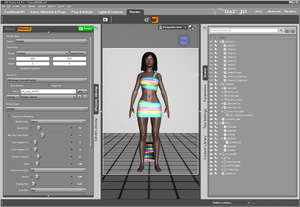 Select G2, select all her surfaces in the surface tab, go to your content library, shaders/DS Defaults double click dzDefault. When you're done getting your lights right reapply the good character skin mat. Or do like I do and apply the morph but not the skin texture for the character and turn off the HD morphs until I have everything else set up for final render.
