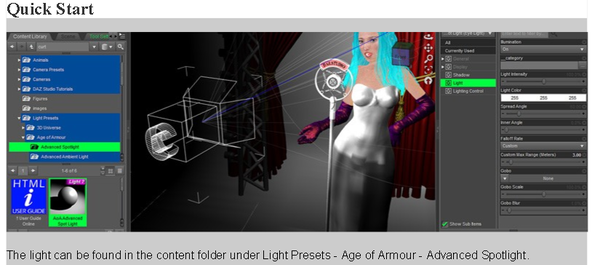 AoA lights, well it looks pretty when some one else that knows how to make them work has made the promos. dose it at least come with a "The light intensity control is here in Daz studio 4.6"? 24usd, well I kind of already spent all my have play funds, it will have to wait till next month. The PDF is mostly Greek to me, and the one over-cropped partial screen-cap looks rather outdated (It dose not show what tab the settings are in, whatever former version of Studio that is). (EDIT, that screen-cap is not even legible)