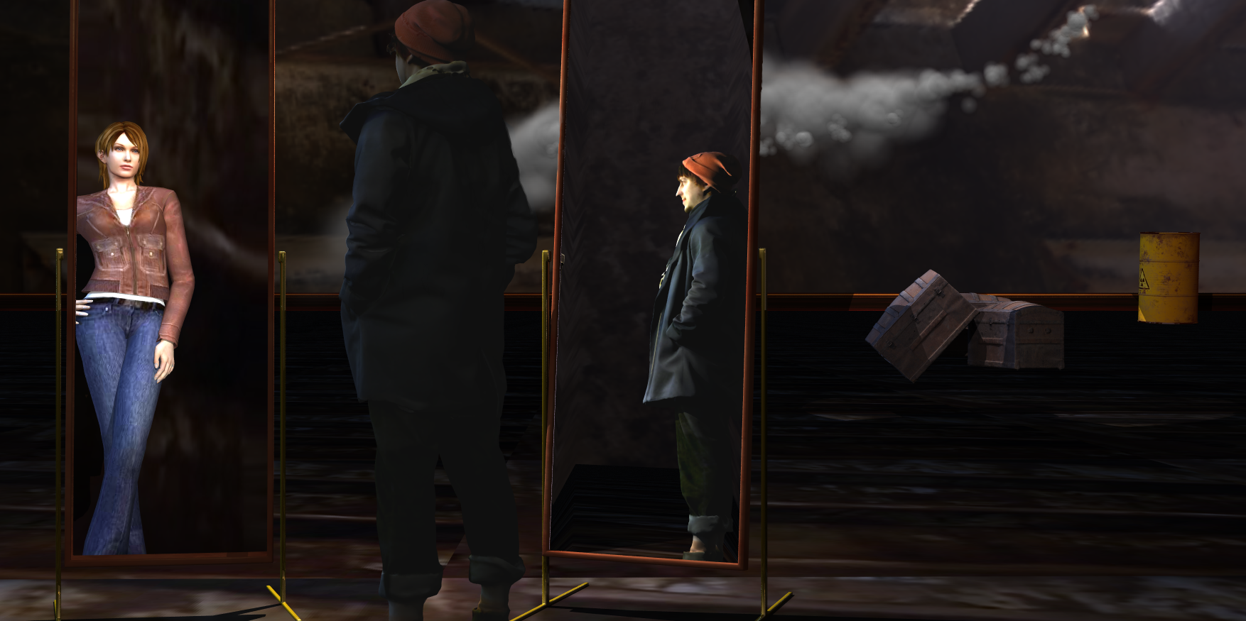 Horo...NGartplay..thank you..... It was a bit of a faff setting everything up to place the girl outside the field of view of the camera to give a true reflection whilst keeping her out of the mirror reflecting the man ;making the right hand mirror the true reflection of the man and .the left hand mirror how he is seeing himself