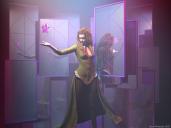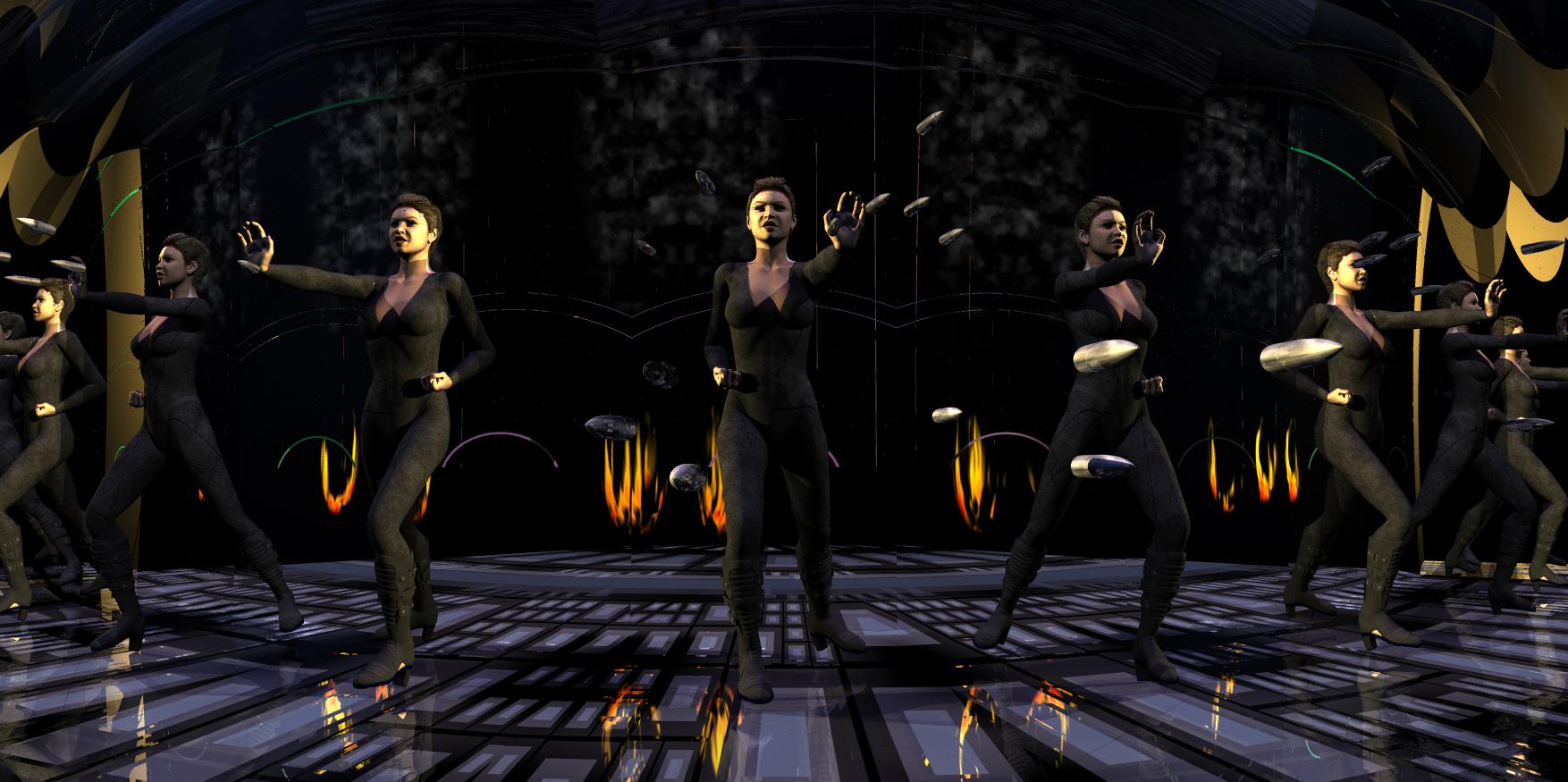 Genesis 2 female, hair and outfit from DAZ3D. Spiky object and mirror created in Modo. Mirrors random replicated in Bryce. Scene surrounded by a “smoky" volumetric Bryce cube. Illuminated by 4 multi colored spot lights. Rendered at Normal AA, about 2 hours and 45 minutes.