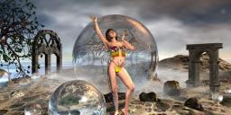 My second entry. The illusion of a (half) ring of lady fighters. I used one lady, one of the Genesis series with a character. I always forget to note down which one and then do not save the DAZ-file, sorry. There is also one fire, one smoke column and multiple bullets. The illusion of the ring of fighters, of course, created by two reflective planes. And there is a home-made lens giving the slightly circular effect and the strange items at the upper corners of the render, which I happen to like. The girl is inside the lens. Lights from the sun and a HDRI containing sky by Horo, as well as a distant light. The green and purple and brownish stripes (curved or straight) are caused by an additional sphere, slightly smaller than the lens and cut-out by two negative cubes to prevent the girl to be cut-off by the (metal mesh) texture of that sphere.