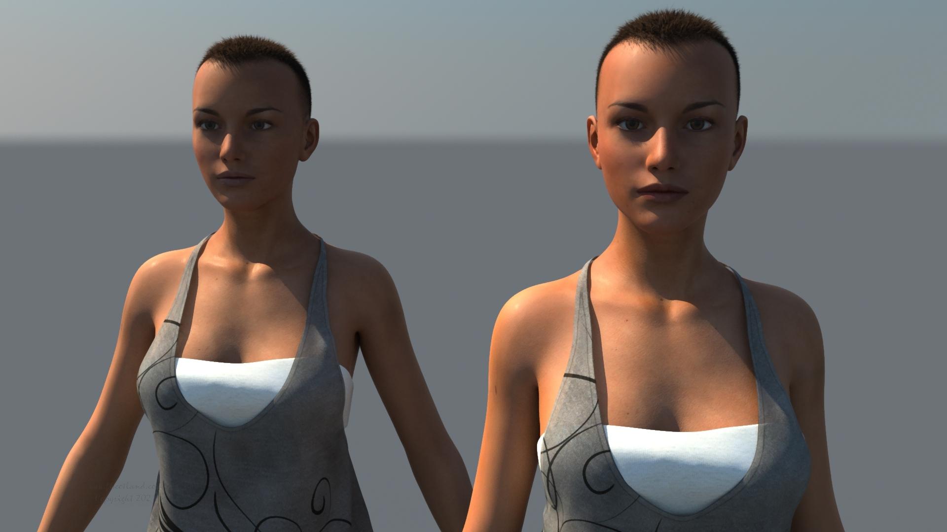 Old skin converted with Iray Uber Shader on left. New Iray skin on right.