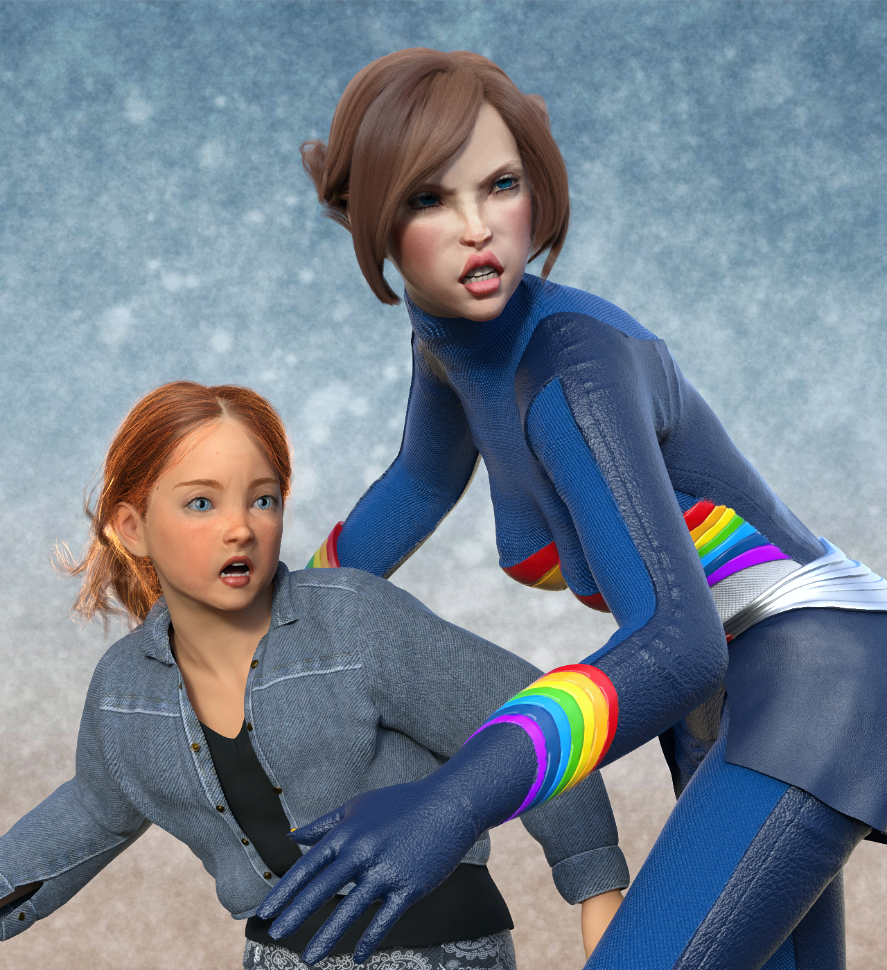 Heaven has the short version of Ophelie Hair, which doesn't have too many options but I didn't dForce. I also didn't mess with the long version, it would look silly with a Rainbow Rangers outfit IMO. Too girly. NOTE: I completely filled in the right side (as WE look at it) because it curves waaaay out from the head with a huge gap. Looks cartoony. I also added strands at the tips on both sides as they were very blunt cut. So in summary, a LOT of work on the Ophelie Hair to make the short version look good. (But fast and easy to do.)