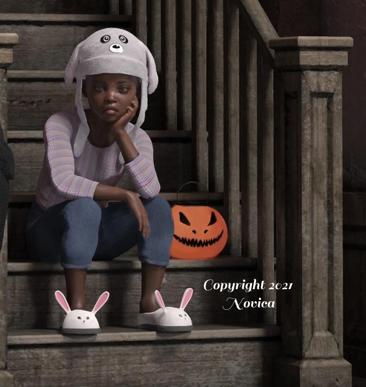 @Novica, As I moved the screen from the wonderful picture of the little girl on the steps down to the cartoon version, I got the feeling that the character was melting away in the cartoon. Weird. She looks so fed-up with nothing to do, or no one to give candy to, or no tricks to zap someone with... Great image.