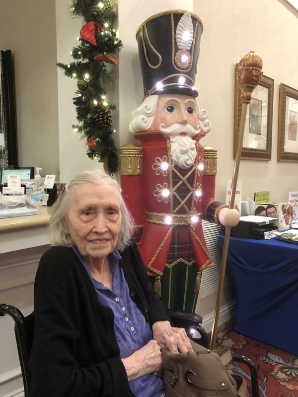Mom is next to a four foot tall nutcracker. She's still so much fun at age 94!