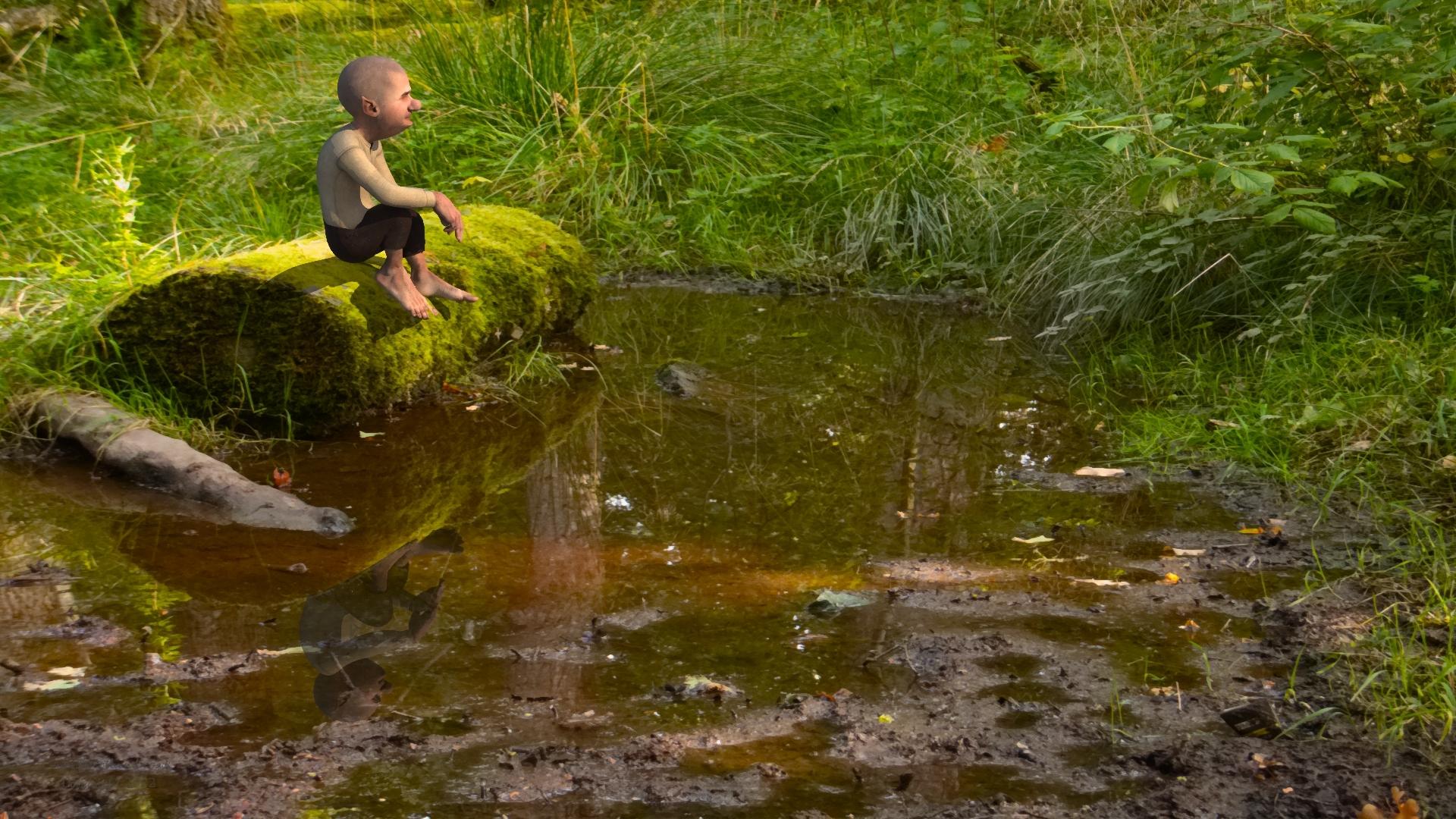 Took a while to get this to look right. It is one of my pictures as an Environment Background and getting the character to look like he was sitting on the log and getting his reflection half believable took a few hours of trial and error :) I used three Matte Objects. One for the log (cylinder), one for his reflection (plane) and one to cut the reflection at the bottom of the log (cylinder).