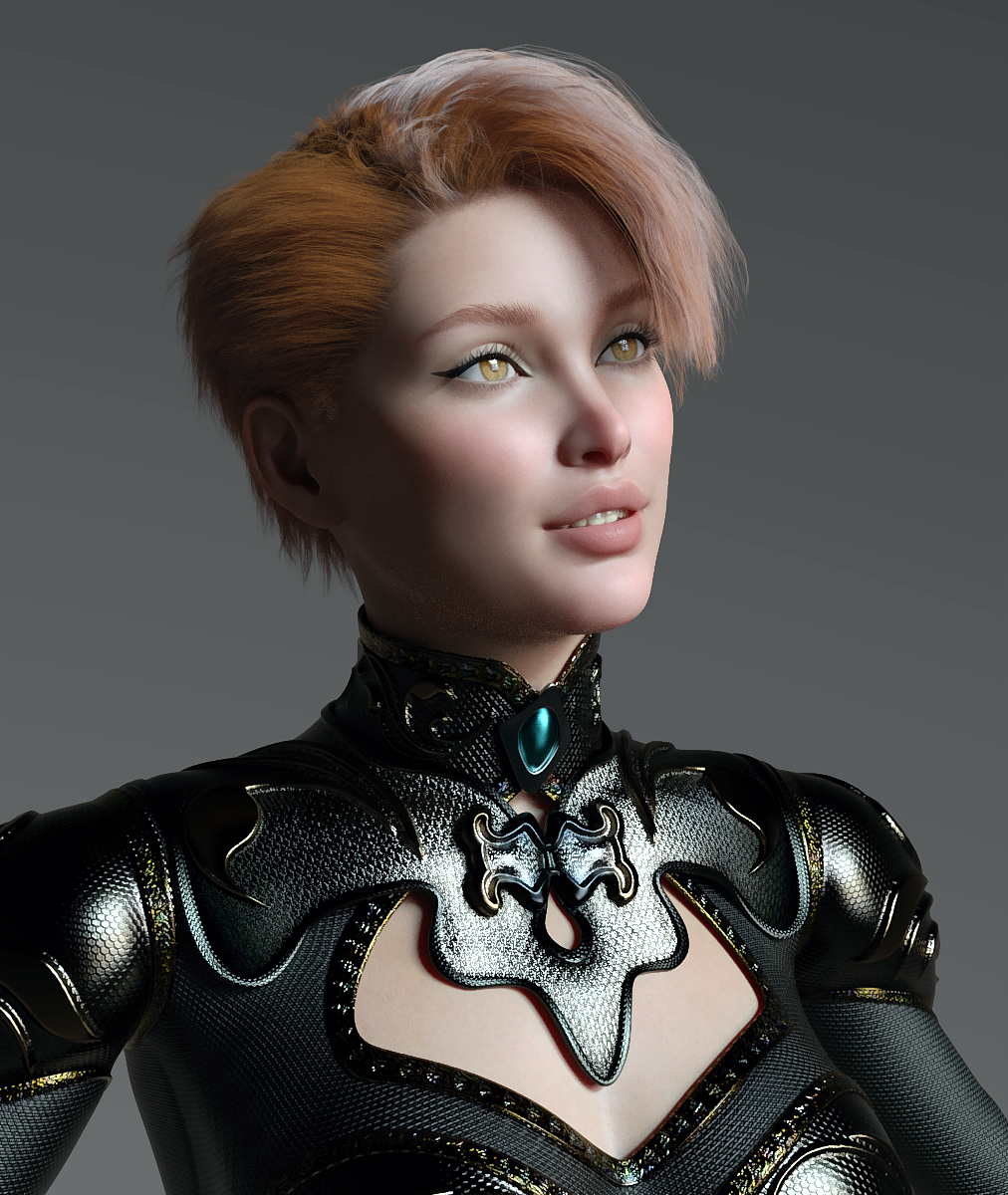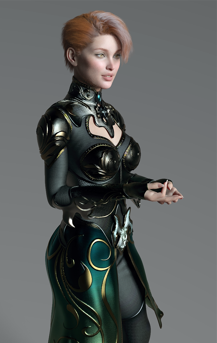 The alien Sentinel Outfit is greatly discounted, and you can kitbash to get a good fantasy headpiece or the outfit, or the weapon. Not sure when it will go offsale, so I am posting this render before it is done. It's at about 70 percent. I personally don't like swirlies on the breasts but depending on the angle of the render, it can be worked around. (Or the lighting can diminish them so they're more subtle.)