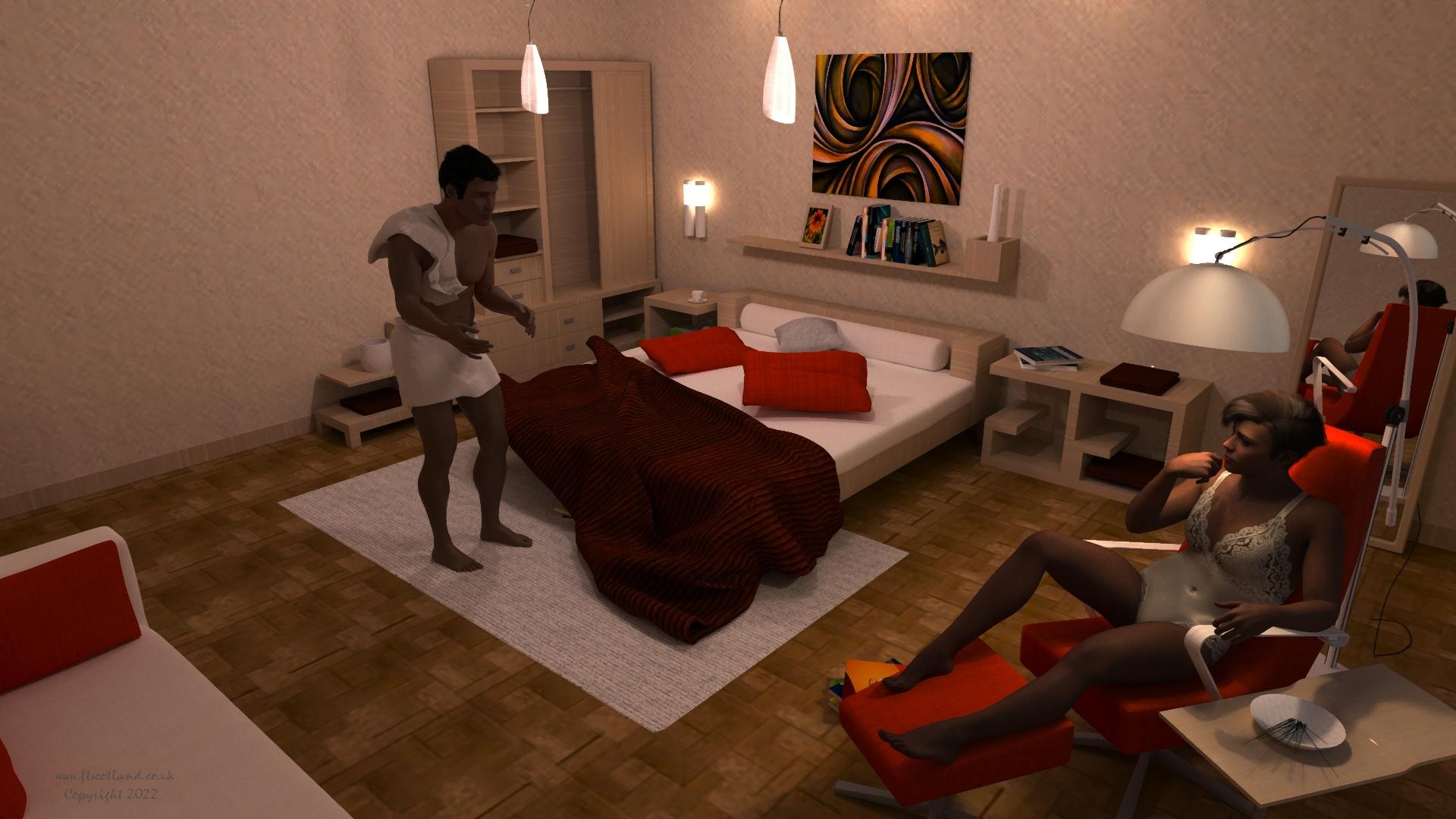 I had to do a bit of work on this one as all the furniture is one figure so I had to use the Geometry Editor Toll to make the Blanket, Standing Lamp and the Cushions separate items so I could move them and Dforce the Blanket. I also had to use the Joint Editor Tool on the lamp so I could get it posed behind the chair.