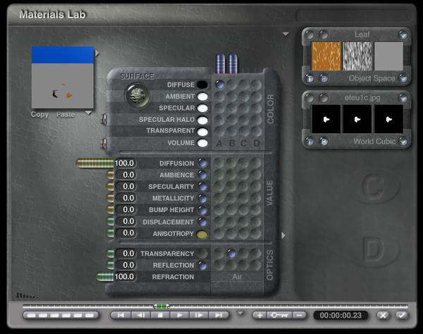 Originally I was looking at applying a picture of a spark to the particles, so that I could drive it from the ambient channel to get glowing sparks. It was only when the mapping became a problem that I changed my idea to a leaf. When I get a minute, I'll maybe return to the spark idea.