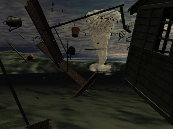 A few months ago I was trying to do an image using the particle emitter that I had been dying to try since I got Bryce 7 and had seen Horo's tutorial... As has already been said, it is sometimes a difficult "tool" not only for it's sphere only particle shape... However I tried using it for the debris flying from the tornado... With volumetric clouds taking so long to render to see if the "particles" were where and when I wanted them... It became quite frustrating and I have thus designated this as a WIP that I really have no intention of revisiting... In this case I would have better used the multi- or random replicate of actual objects of my choice... I'll play with the emitter another time...