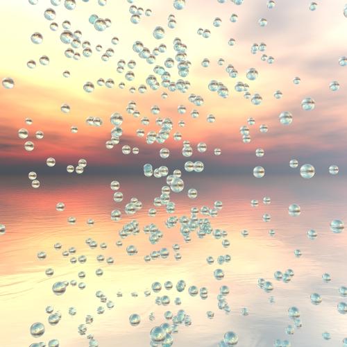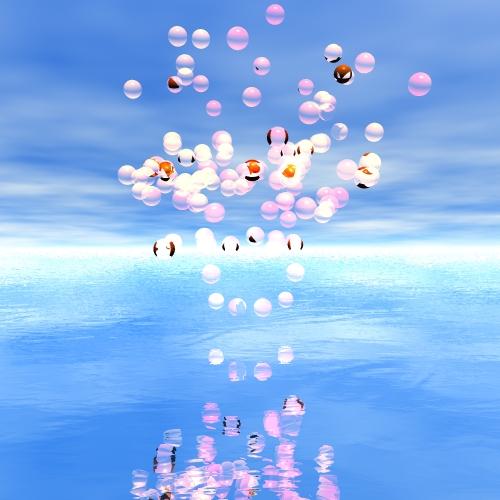 Thousands glass balls falling from the sky, and landing swimming in the lake.