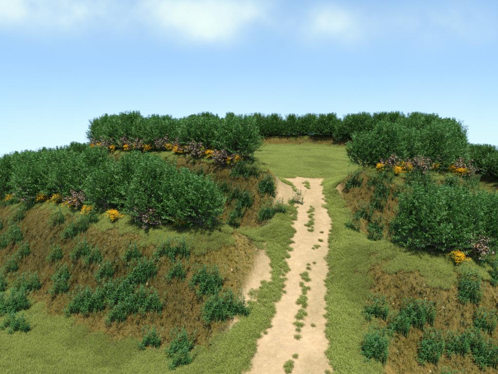 Thank you, both. Here's my latest - I was practising with a more curved hedge layout. Ultrascenery again, one of TA's Upland features, with a mixed-set hedge on each ridge and a few Ultrascattered nettles on the steep slopes because they looked a bit bare. I wondered how Hedgemaker copes with extreme slopes? (I should have experimented for myself and may do so tomorrow if I have the chance)