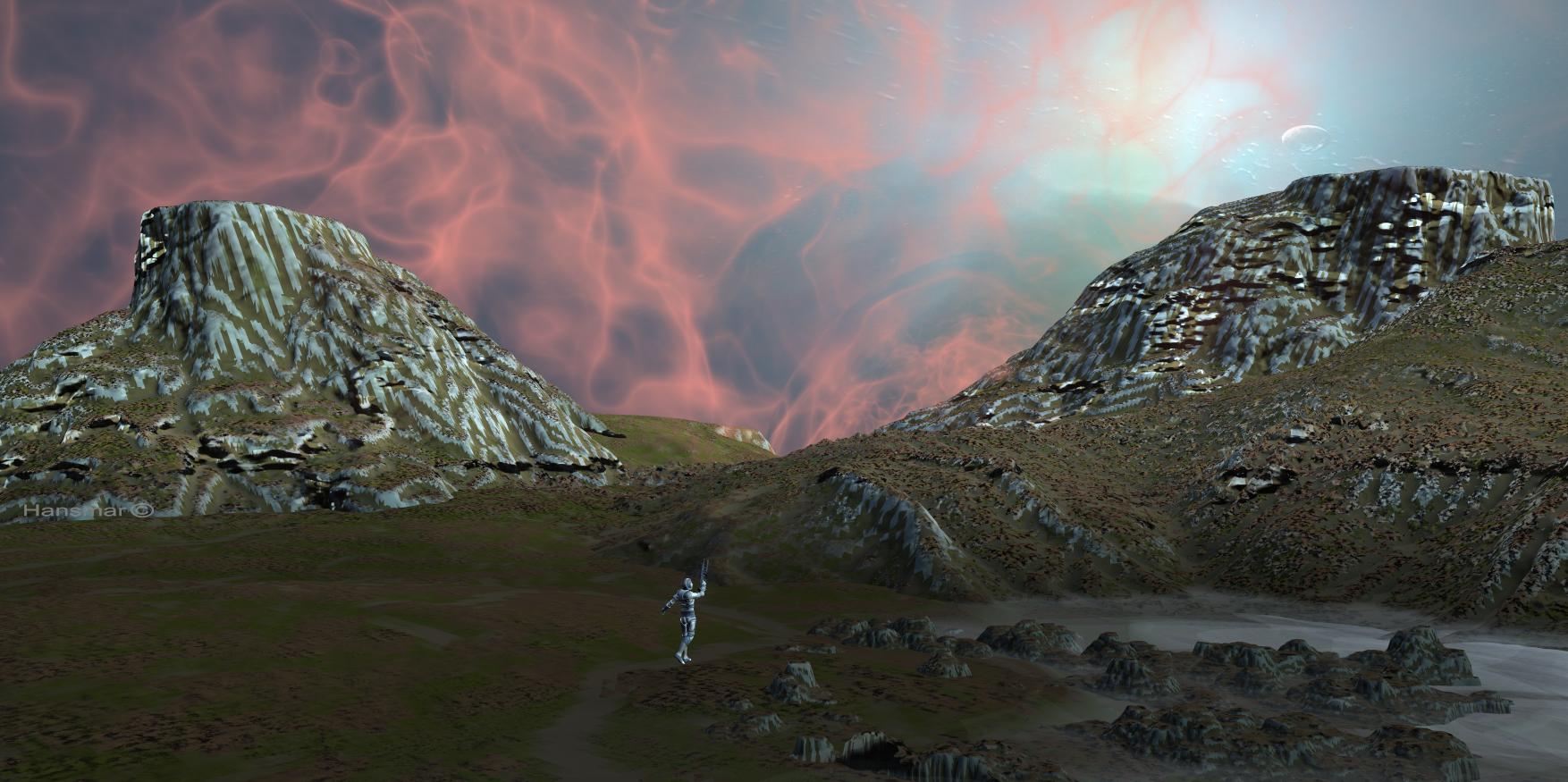 I picked up the Bryce Atmo, modified scene 1 quite a bit, with modification of texture of the spheres and the 2D face as well as of the terrains. I also moved the camera, added a weak distant light (only influencing the terrains) and added a Marauder (Genesis with Marauder items). Terrain texture is from the Gritstone Hills materials. Great scenes with lots of potential, I think, these works of RajRaja! And for this price :