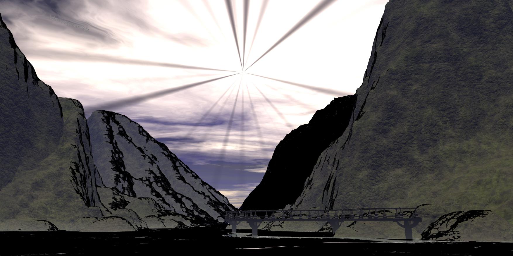 NGartplay: thanks. The dark rays is a 2D plane at the same site as the sphere light with a texture leading to that result. The colours of the scene are caused by a combination of the sun, which leads to the green and the pink, and the sphere light, which I made negative. So, where there would be light on the mountains, there is now a dark place and therefore the water is also dark.