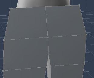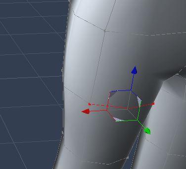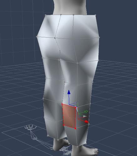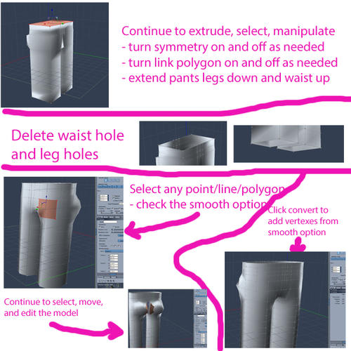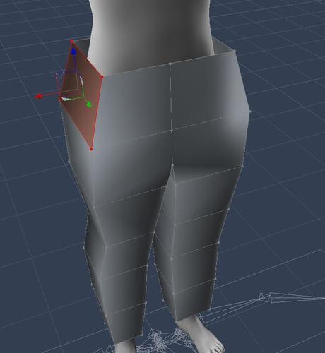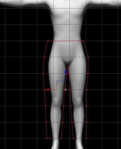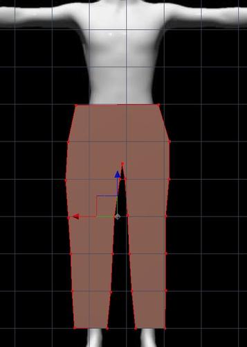 - ADJUST LEFT LEG HOLE - Making sure symmetry is active, select the two polygons that are the inside front of the left leg hole. (remember can hold down shift key for multiple selection). Now, hold down shift and re-click the the front three vertexes (points) of the selected polygons to deselect them. This will result in the middle vertical line of the left leg remaining selected (and mirrored with symmetry). Use the arrows to pull theline toward the middle until the left leg goes through the hole. The right side will be mirrored.
