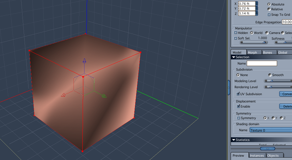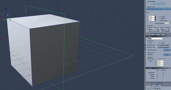 - SYMMETRY - only after at least one point is selected will you be given the option of using symmetry. In the middle of the properties tray, once anything is selected, the word symmetry will appear with a small empty box below it. Left-click the box to insert a checkmark and symmetry will be turned on. You will be given a choice of axes to the right, leave it as the default X. A green box will appear around the middle of the cube.