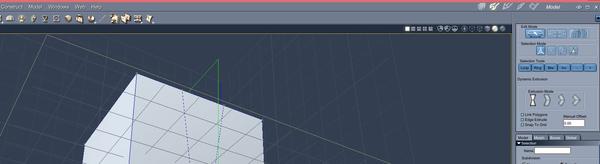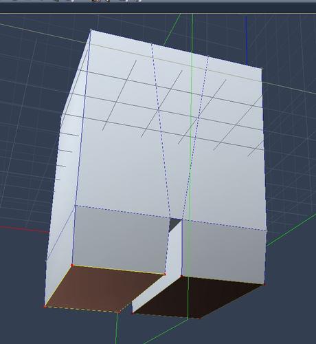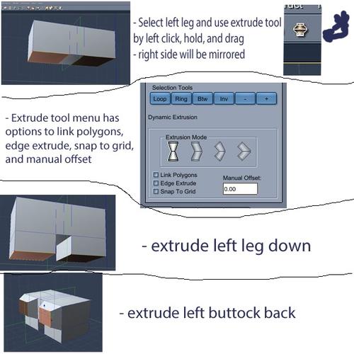 - EXTRUDE LEFT PANT HOLE (Right will be mirrored) - The cube should now look like it has a V-ish front. Again, left click anywhere away from the cube to make sure that nothing is selected (everything is gray, nothing is red or yellow). Hover your cursor over the bottom left square of the cube and left click to select it. On the top menu, left click on the dynamic extrusion tool (it looks like a vase under the "t" in the word construct). On the righthand side, in the properties tray, you will see options for the extrusion mode, such as linking the polygons, snapping to grid, manual offset, etc. For now, leave the default settings. OK, with the dynamic extrusion tool selected (it should glow a little on the top menu), left click and hold/drag on the selected left pant polygon and drag it down. You may have to experiment a little to get the feel for how it comes down vertical compared to making it wider or narrower (remember undo!). It should be mirrored on the other side