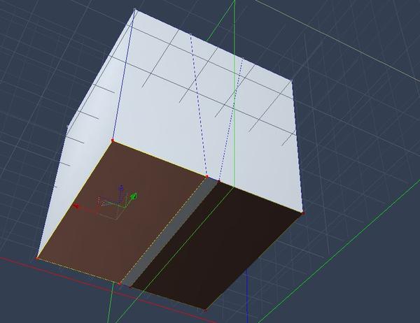 - PULL THE BOTTOM LINE CLOSER TO THE MIDDLE - The cube should now be divided into thirds. We want a narrow crotch and wide leg holes. Use the camera controls (left side) so you can see the bottom of the cube. Hover your cursor over one of the bottom middle lines and left-click to select it. The two end points should turn red and the line should turn yellow. The three arrows should appear. Left click on the red arrow point (x axis) and drag the line closer to the middle of the cube, still holding down the left-click. Do not go all the way to the middle.