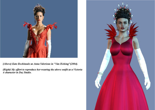 1) Kate Beckinsale as Anna Valerious, wearing the red gown from the vampires' ball scene in "Van Helsing" (2004); based on MRL Elise (which is a close match for Ms. Beckinsale to begin with), with Royal Princess hair.