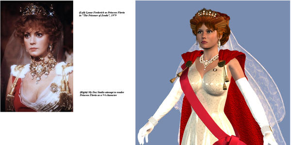 3) Lynne Frederick as Princess Flavia in her husband's (Peter Sellers) 1979 version of "The Prisoner of Zenda", wearing the white gown with cape from the coronation scene; she's based on MRL Riley, with a moderate amount of spinning the dials on the face morphs, and again, she's wearing the combination of Isabel and Classic Rolled hairdos.