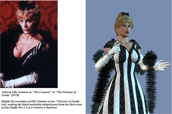Thanks! Here are two more: Elke Sommer as "The Countess" in the 1979 "Prisoner of Zenda" wearing a black-and-white-striped gown, and Ornella Muti as Odette de Crecy in the 1983 "Swann in Love", wearing a pale-blue gown (both prominently on display in their respective films).