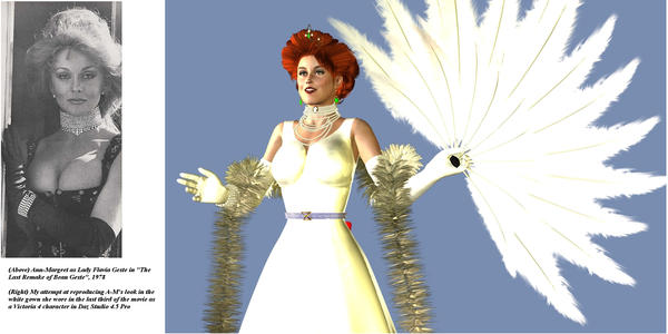 2) Ann-Margret as Lady Flavia in "The Last Remake of Beau Geste" (1978), wearing the white gown from the Fort Zinderneuf sequence that takes up the last third of the movie; she's based on MRL Elena (with a LOT of face tweaking) and wearing a combination of Isabel and Classic Rolled hairstyles that I was taught to make a couple of weeks back by a fellow artist and which produces a pretty good simulacrum of a "Gibson Girl" hairstyle.