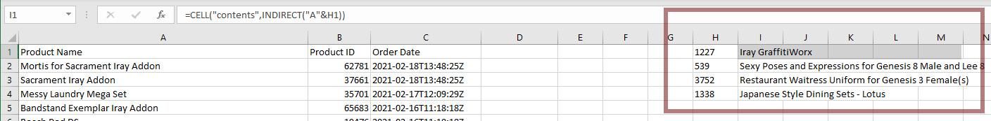 =CELL("contents",INDIRECT("A"&H1))  Where A is the column your product name is in, and H1 is the random number generated.  Also, the number is generated each time you edit / save so copy and paste values to get your pick.