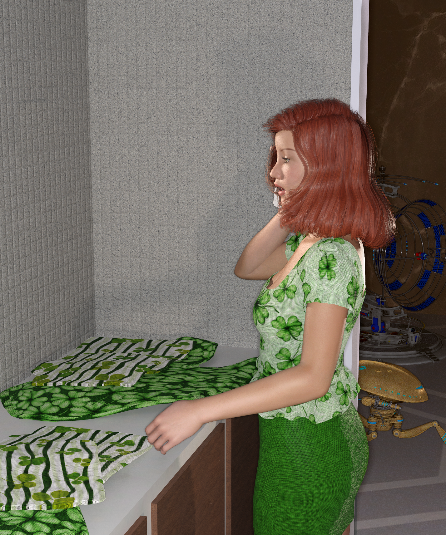 I know I'm already running late with the props for the sci-fi convention, but I really do need to buy a new outfit, first. Incidently, I've just figured out why that 'Shamrock' detergent you insisted on buying was on clearance...