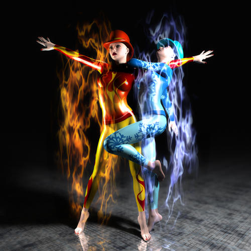 I made the body suits for the V4 models (the top hats are from the Skulldugggery set), posed them in Poser and imported the pair into Bryce, made the materials look better and added the red and blue flame effect. Rendered and saved as .HDR file.