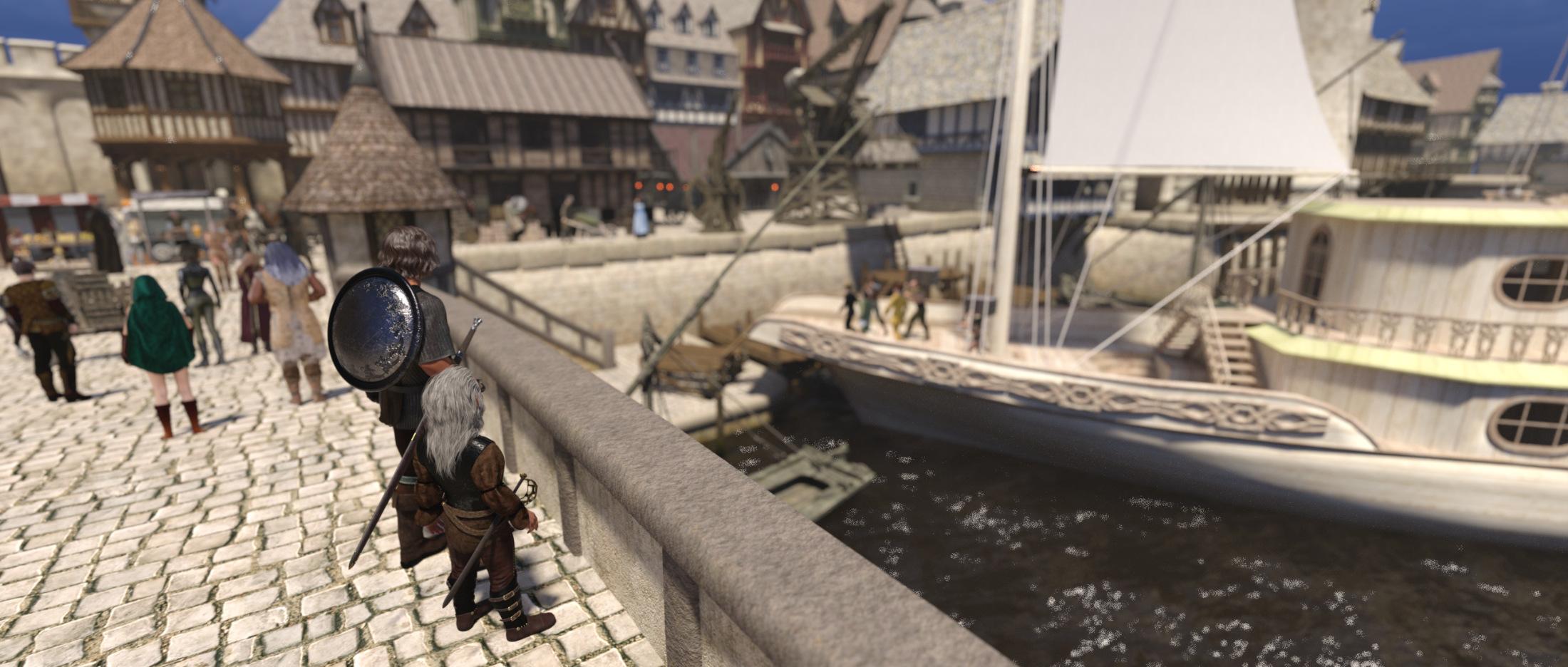 On the way to the docks they cross the bridge over the river and they can see a large ship docked at the docks. It has large sails and is really eye-catching. There is even a special gangplank laid out, as the ship is much higher than the usual smaller ships and fishing boats that usually docks here. The docks are across the river from their rented room and the tower. They see a lot of people leaving the ship, looking like rich merchants arriving for the festival and market.