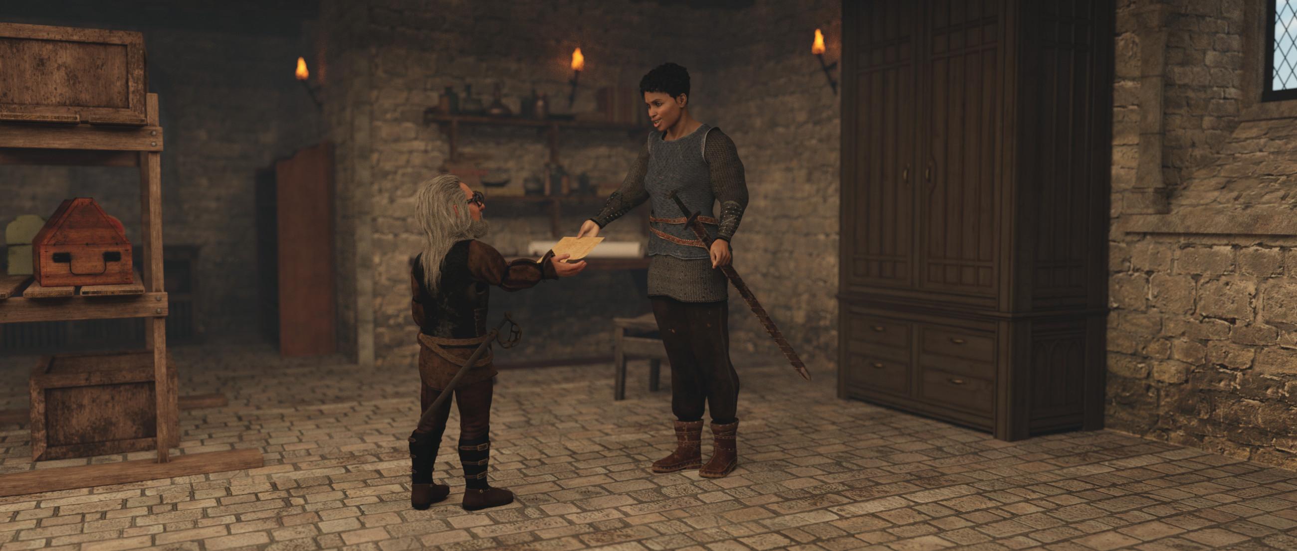 Gnosha and Aered stock up, and walk to the South Gate to see if they can rent Amadeus and Peridot again, and they can. They are told not to wear the horses out ever again, or this is the last time they can rent a horse in Erast. They lead the horses through the town back to the tower and pack the bags, sacks and packs with food and water, and also the tent they got as a reward at Luckfall. They decide to exit through the West Gate, and stop there, as Gnosha is looking for Lieutenant Gidaadee. When Gnosha finds the Lieutenant in her commander chamber, he hands the letter over to her and says: - “Good day Lieutenant Gidaadee, can you please assure that this letter is delivered to Sir Heskan?”