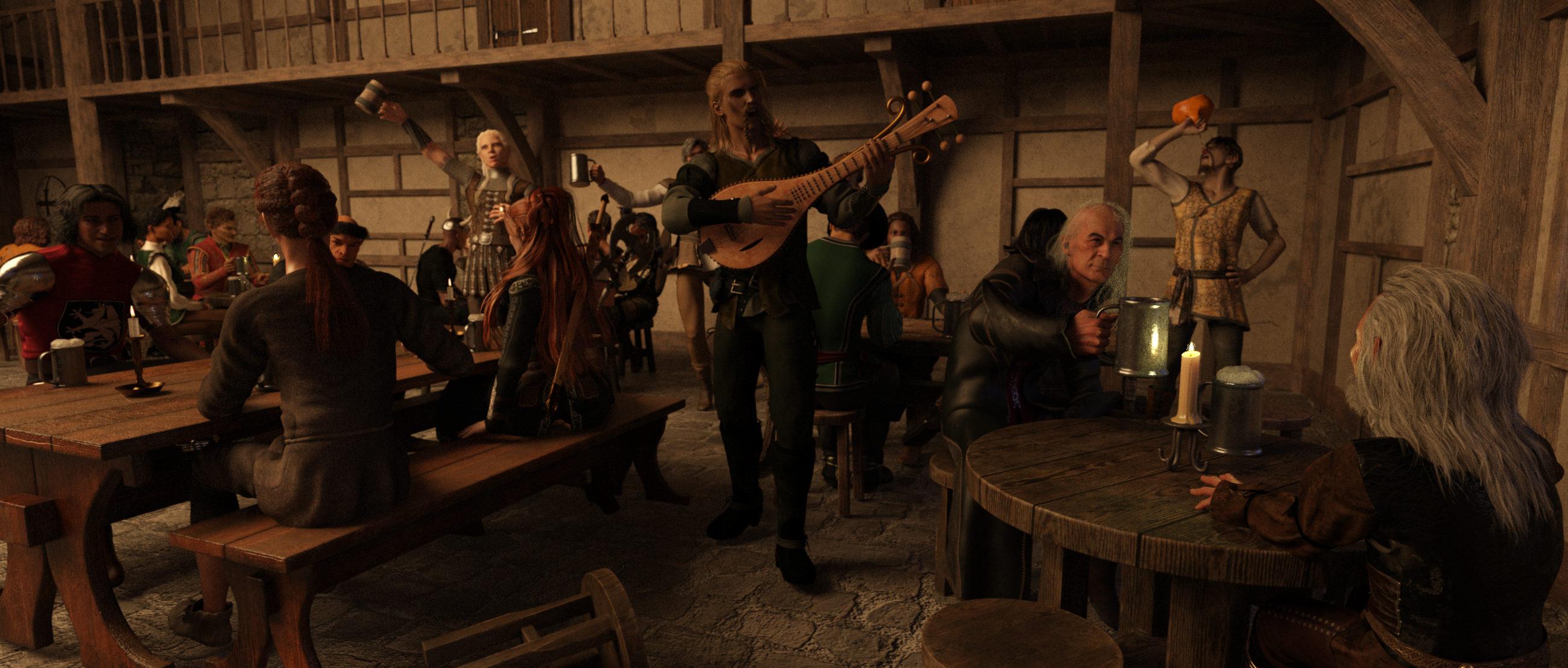 After the song, people cheer and the bards go around with a hat to collect coins from the audience. Suddenly one of the bards spots Gnosha and Aered, as they went back to their makeshift stage and began to sing another song.