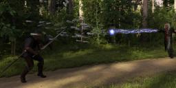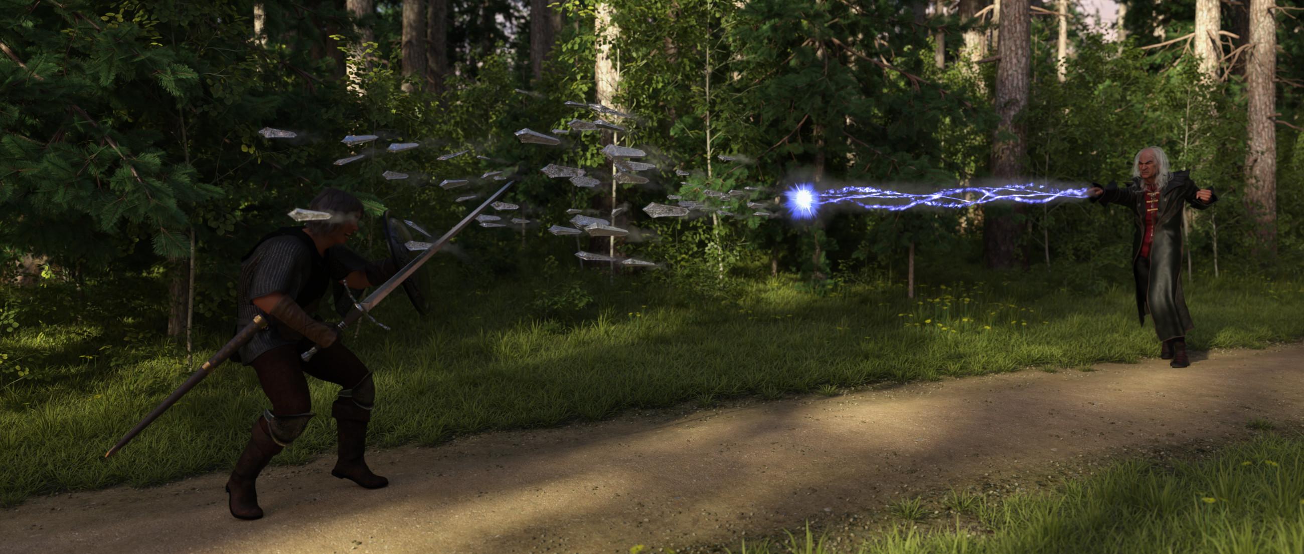 The man uses magic and raises a magic shield, and when Aered comes close, the man looks him in the eyes and says “Flee!”. Aered is terrified and runs away from the man. Gnosha silently swears: - “I hate wizards and magic”. Gnosha fires again, misses, reloads, fires again and misses again. Aered is now on the road, about 60 feet away. The man makes strange moves with his hands, and three magic missiles form and hit Ghosha in the chest, it hurts. Gnosha shouts: -”Aered, what are you doing? He is there!”