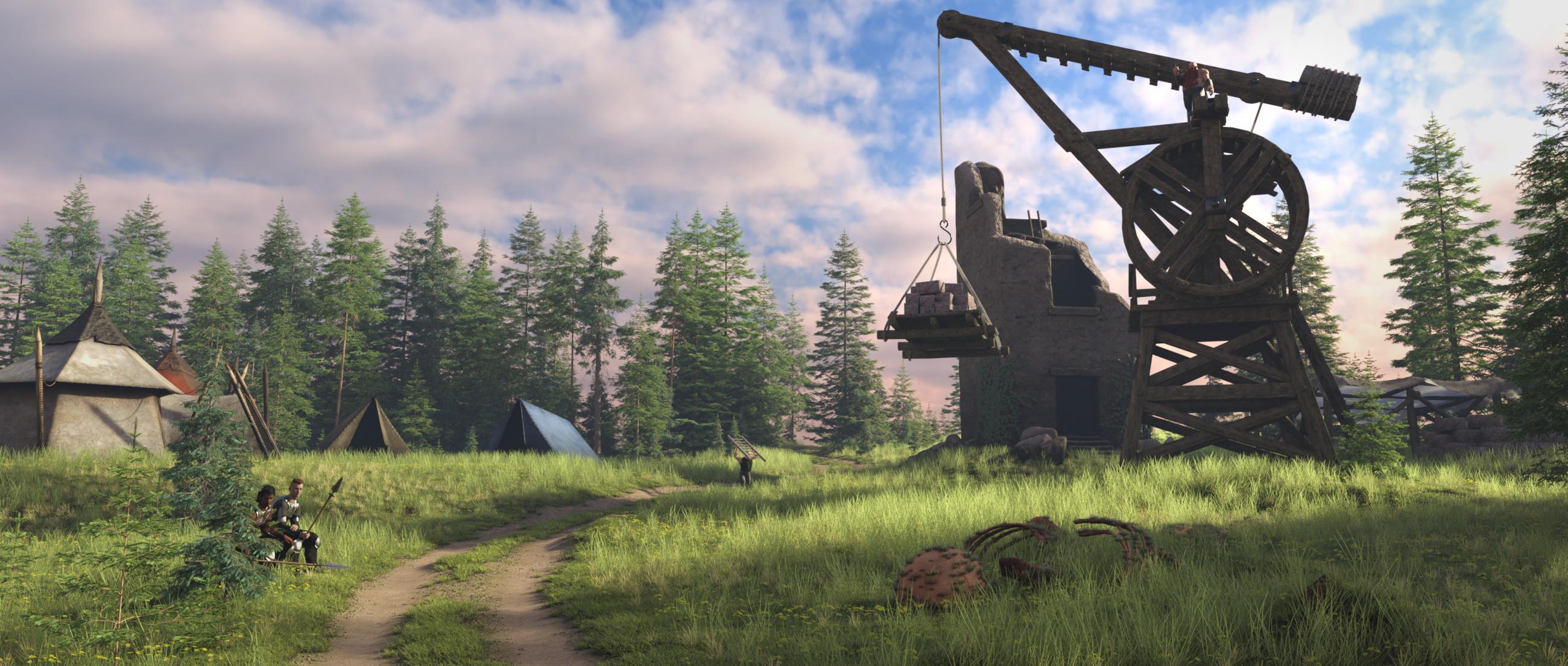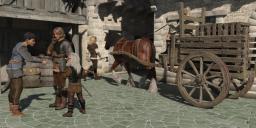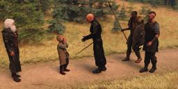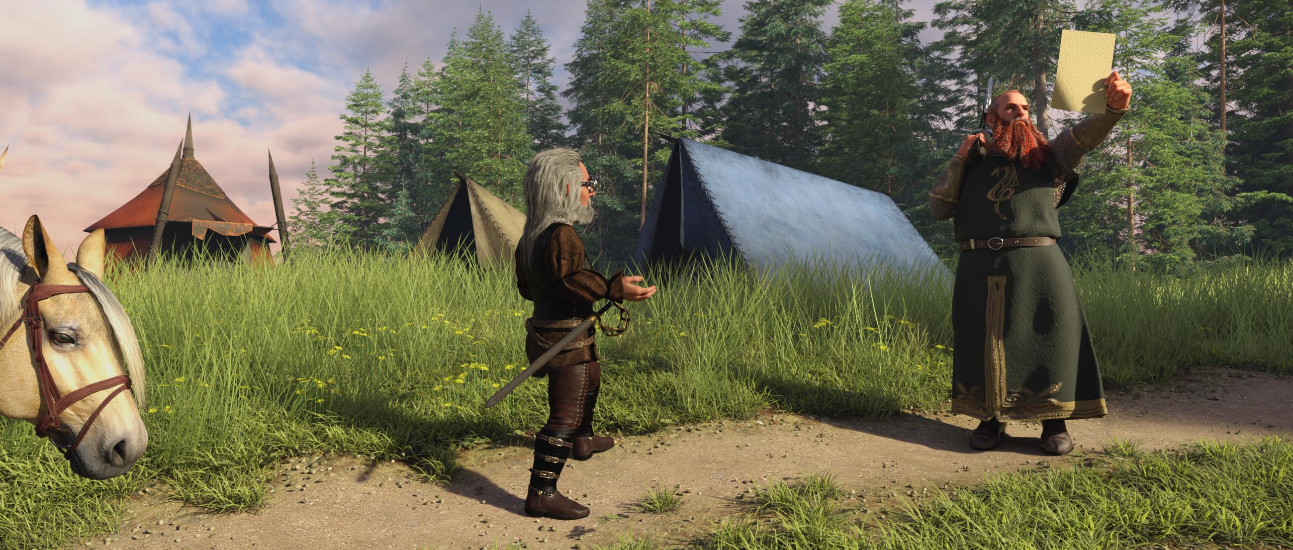 After a couple of hours, when the sun was really hot, Gnosha saw a lonely traveler in a large hooded cloak, with a walking stick and a large backpack. The hood made it impossible to see the face. When the man came to the bend and saw the checkpoint, he slowed down, looked, then stepped to the side of the road. Gnosha raised his Crossbow, prepared with Alchemist fire. Aered slowly and silently drew his longsword. The man moved to the side of the road and hid behind a tree. Aered tries to take a few silent steps closer, but the rattles from his chainmail give him away. The man turns around, and Ghosha shouts: – “Halt! Hands in the air, you are under arrest!”, but nothing happens, so he fires his crossbow and hits him in the chest, then Gnosha reloads. Aered rushes forward.