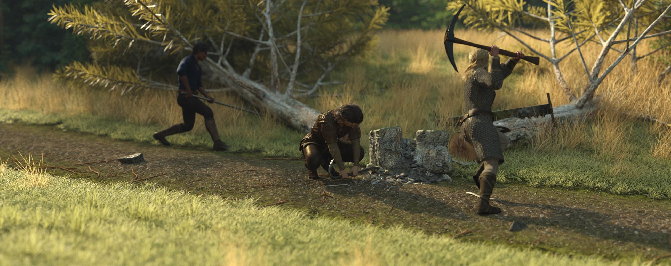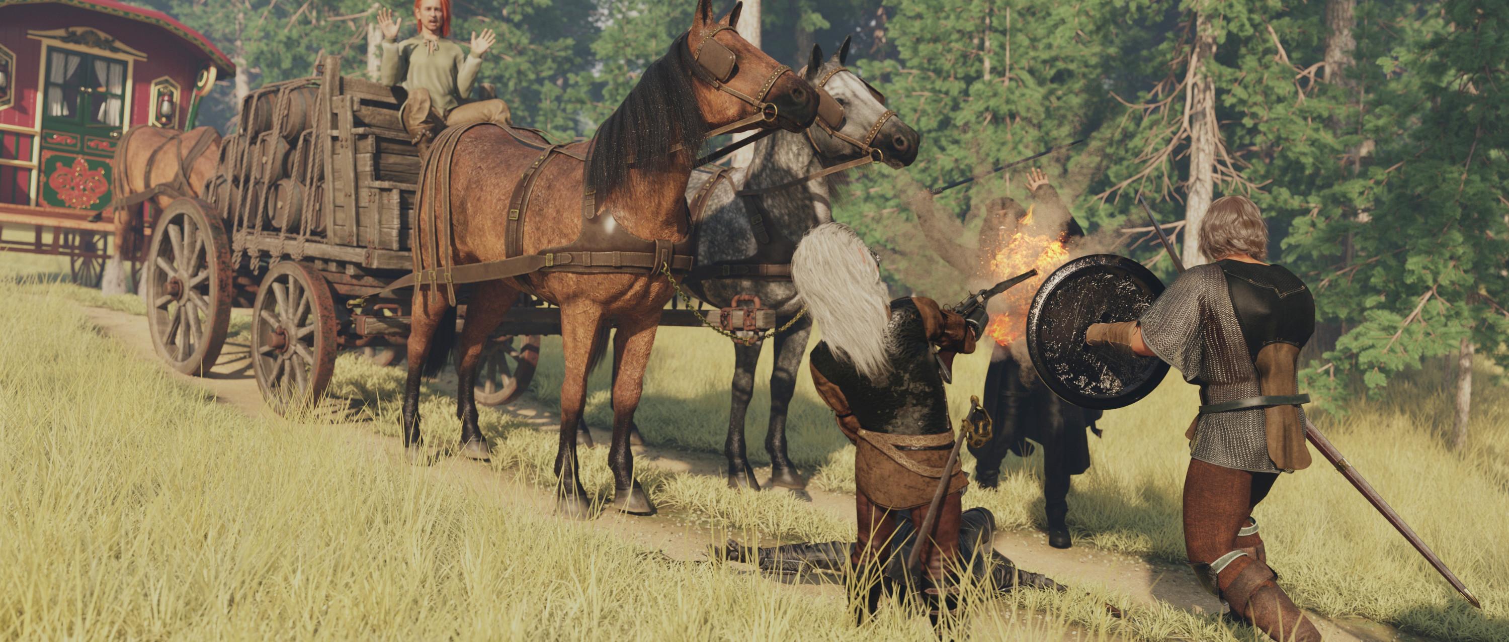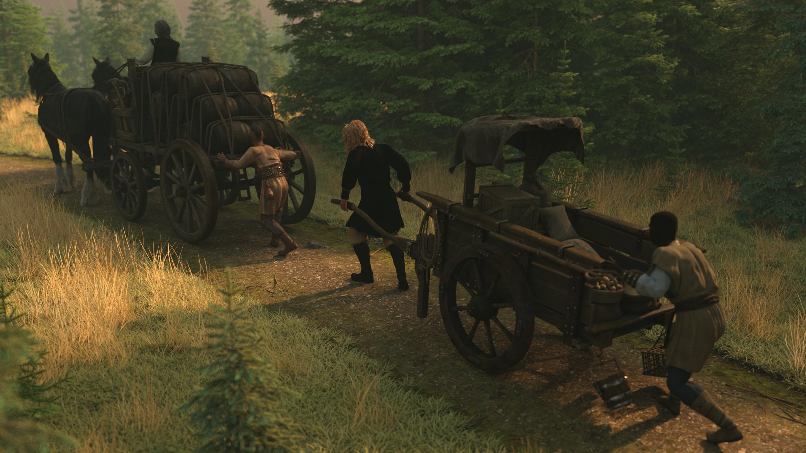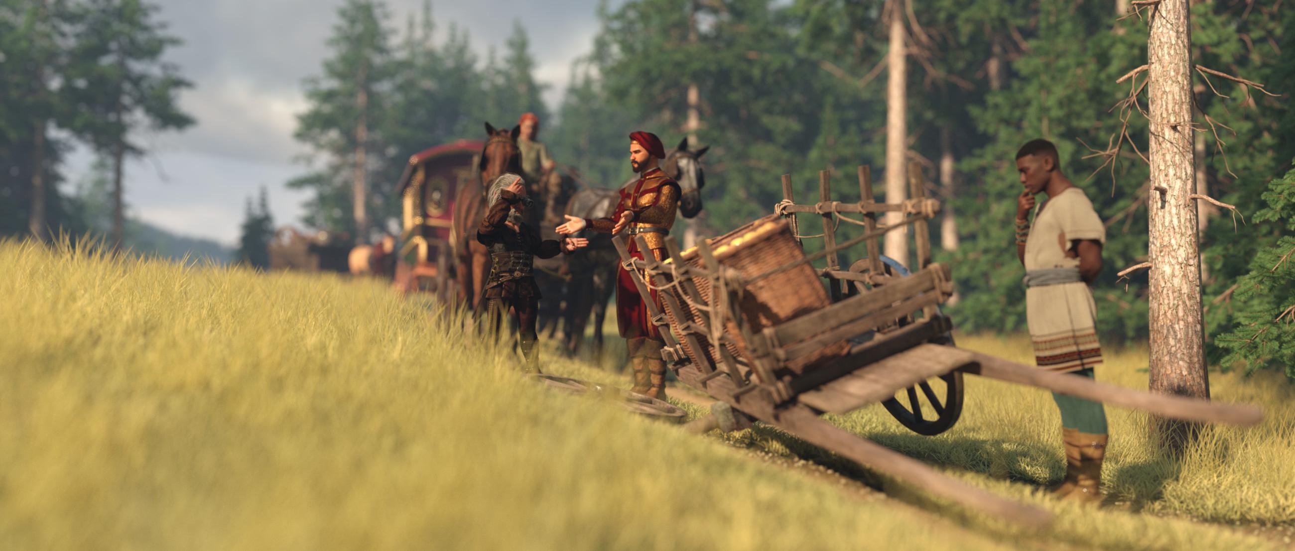 A merchant shouts: - “Anyone handy with woodworking tools, we need to get this wagon moving as fast as possible.” Gnosha, who is a skilled craftsman, puts his crossbow on his back and volunteers, but he just can't figure what’s broken and scratches his head while counting the number of days it will take to mend and says: - “This wheel is totally broken, it just cannot be fixed. We need to cut down a tree, build a new wheel, make sprockets, and smith the iron ring, it cannot be fixed here in the middle of nowhere. We better move the cargo to the other wagons.