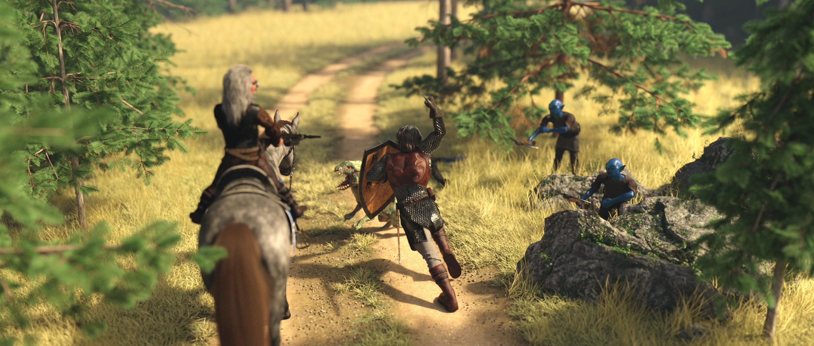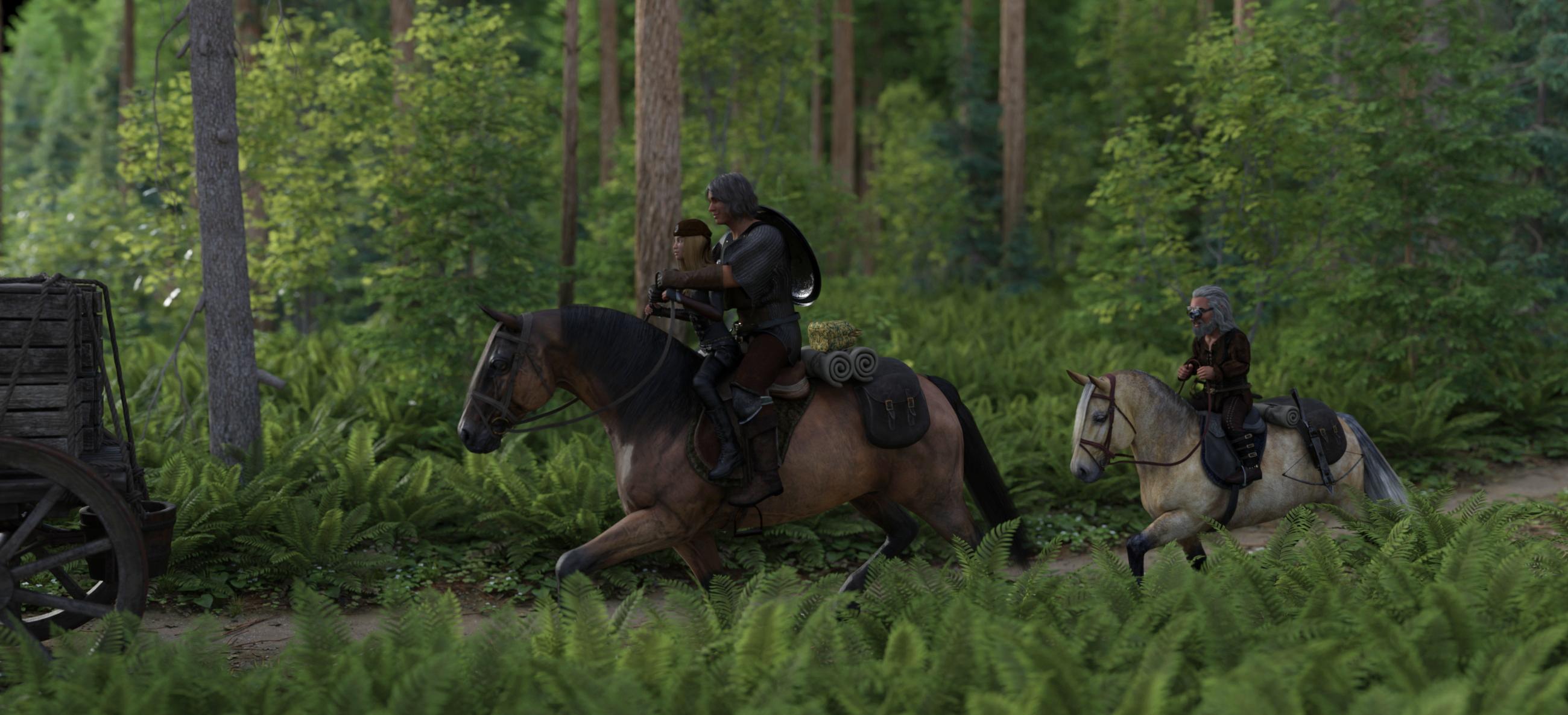 The knights set off at an extreme speed, raising shields and drawing swords. Aered, Gnosha and Thefvae try to keep up, but only Gnosha is up to it, but he slows down when he notices that neither Aered, nor Thefvae is up to it. Thefvae could almost keep up the pace on Firefly Shadow, but Aered was not at all one with Duke Blizzard, so he had to slow down or he would have fallen off. Gnosha quickly decides that it’s better to stick together, this still is Kobold lands, and without the Knights around, they are much more of a target, and three is better than or or two if they are attacked. The Knights, led by Sir Paragon Knight Heskan,  quickly disappear around the next bend in the direction of the fire leaving a cloud of dust behind.
