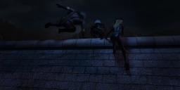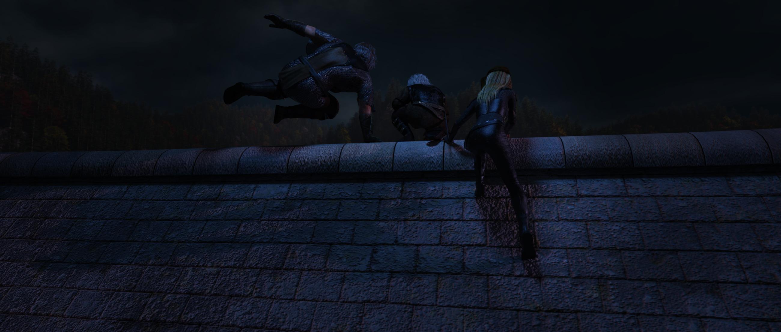 The climb down from the roof of the third house, and down to the ground, on the side facing the wall where there are less windows. After a long and long climb, most scary and difficult for Gnosha, as Thefvae seems to be born climbing roofs, and a Aered has been training climbing walls and roof for years.