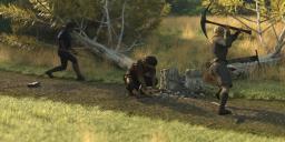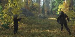 The Kobolds now realize that Aered is the greatest threat, so they all fire their crossbows at him, but Aered deflect the bolts with his shield.. They quickly reload and fire again, and this time two of them hit. Thefvae mumbles something again, and fires off three small darts from her hand and they all hit the Kobold she hit before, in the chest again, and the Kobold falls to the ground. Ghosha tries to see a weak spot on one of the Kobolds, but he hides behind a tree, so he fires at the other one and hits it in the left leg. Aered rushes towards the Kobold hiding behind the tree and first bash it in the head with his shield, then decapitates it with a clean slash with his sword. This shield and sword combat tactics is really good, Aered says to himself. The last Kobold, hit in the left leg, starts to run away, but Thefvae mumbles again, and a new swarm of small darts shoots out from her hand and hits it in the back and he falls.