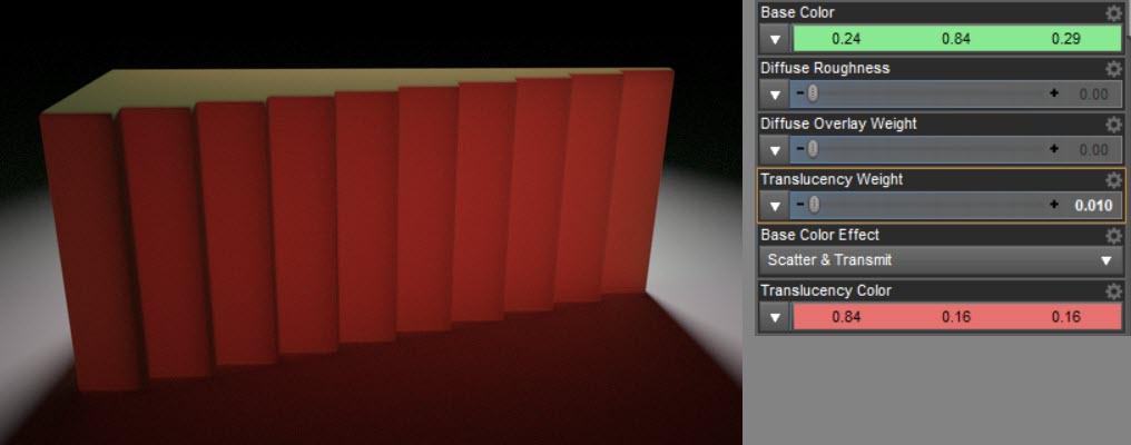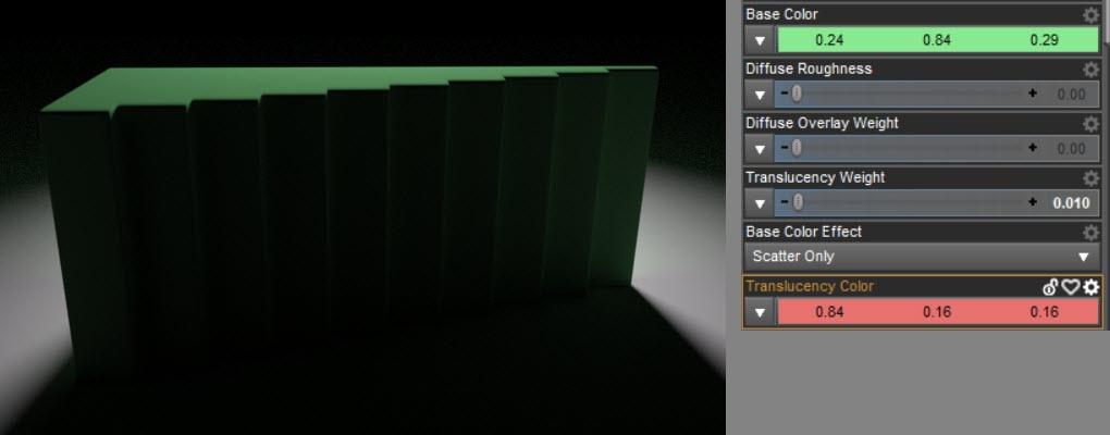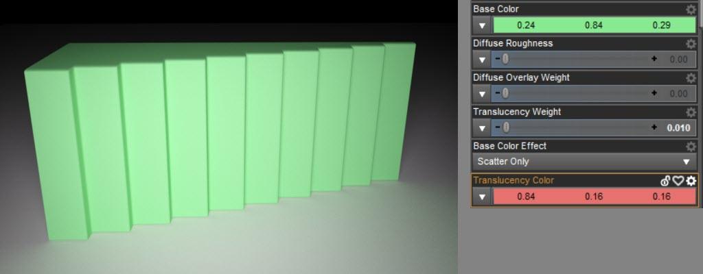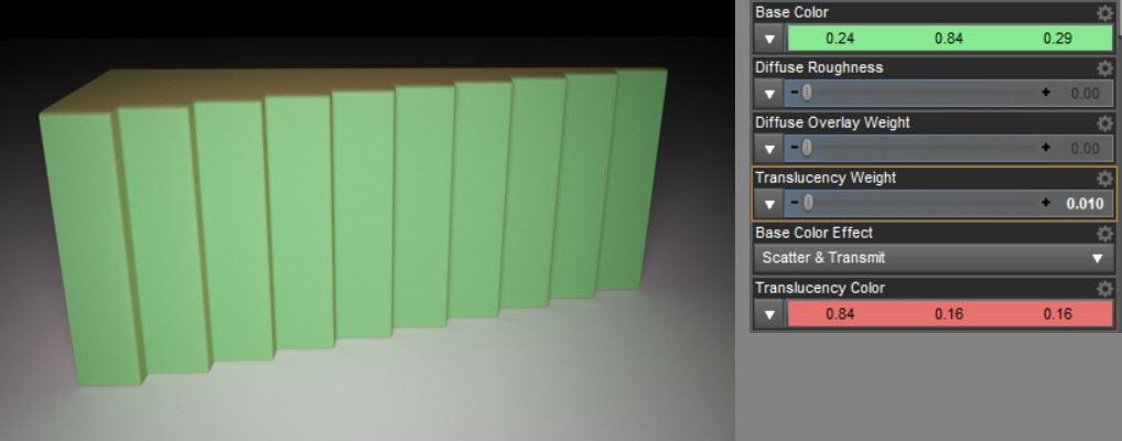 Here comes the interesting part. With scatter, the translucency affects only the inner volume of the object. But in reality not all light stays in the object. Some of the light scatters within the object and then leaves it. That is meant by tramitted. So, in this render the front surface and the background get darker because the dark translucency green now leaves the object and therefore influences the surfaces and surrounding geometry.