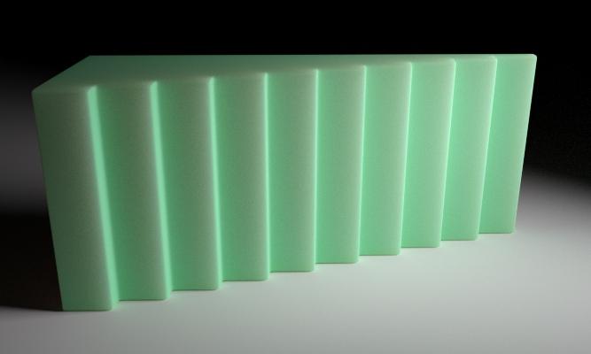 With "scatter and transmit" and a lighter green. Compared to the render with scatter only, now the translucency has a stronger effect. The background gets more color and the surface as well. This looks more like a real translucent material to me than the one with scatter only.