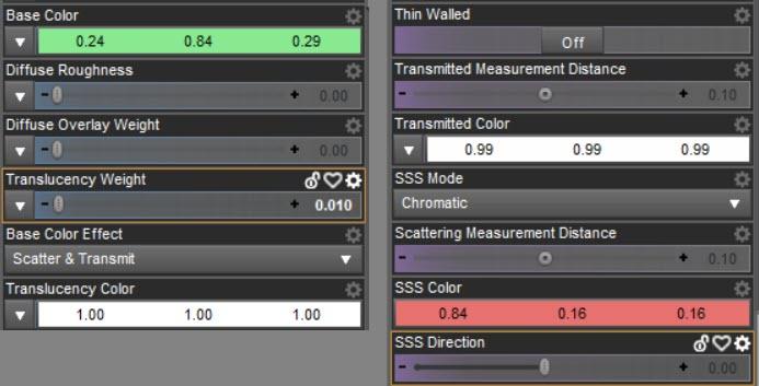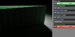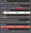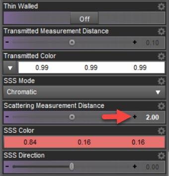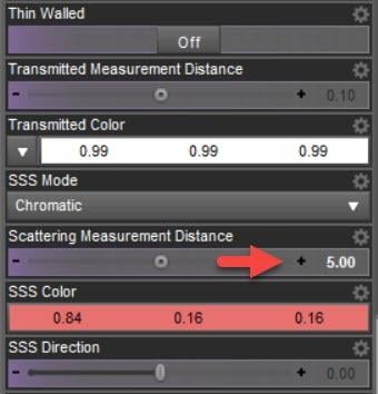 There is one more: "Transmitted Measurement Distance". So far I only changed "Scattering Measurement Distance". But the former one is relevant as well. It tells iray how far the "transmitted" light must have traveled through the object before it becomes the "Transmitted Color". In my surface the transmittet color is nearly white and the value was 0.1.