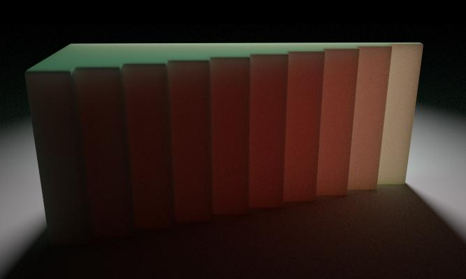 Next render is with thin walled off. Now there seems to be some kind of light falloff caused by the thickness of the object.