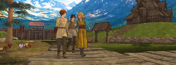I think the background mountains look great but might be taking away attention from the characters with how detailed they are. I would prefer more line width variation, so the dark outlines have thicker and thinner parts. I think the characters could use more contrast with the lights are darks. If your not already familiar, I would look up the rule of thirds for composition, generally want to place focal points at 1/3rd the width & height of the image. I would make the character's clothing a different color than the wood structures in the background or try not to overlap them so they don't blend together. Hope some of that might be constructive.